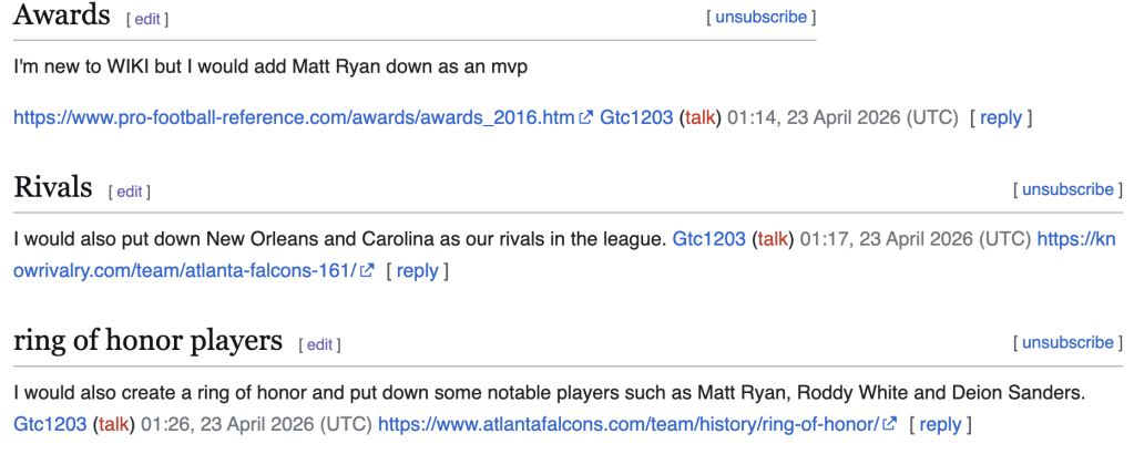 Before I kicked off this weeks assignment, I remember myself making an account for wikipedia because I had a slick feeling that we would be doing something else related to wikipedia pages. I knew that we could make edits and changes and when I found out we were I was kind of excited to try it out and see what would happen. It still probably won’t change my views on the website but I was interested to trying out something I have never done before. My article of choice was the Atlanta Falcons wikipedia page. I wanted to pick this page because I am a die hard fan of this team and I have a deep knowledge and understanding of this team, players, and the franchise itself. I had prior knowledge that this page would have some decent information about them but there was also some recent stuff that could be added such as rivalries and memorable players. Once I finished looking at the entire page, I noticed there were some missing sections that could be added such as rivalries, individual player awards, and ring of honor players. The layout of the page was decently strong and had details about where they play, what their uniforms look like, who their coach is, and when they were founded. My main goal of this assignment was to be helpful and provide some more helpful information to add to the wikipedia page and having reliable resources to back them up. Before I suggested what to add or edit the page I went over the procedures that were provided on the canvas page and went from there. I had to make it known that I was extremely new to editing wikipedia pages. Looking at the talk page I did see that the wikipedia community is very tight and there is a bunch of collaboration. I unfortunately did not get responses when I placed my suggestions. After a couple of days went by I decided to check the page again but his time I noticed my suggestion was added. This made me feel happy knowing my suggestion was considered and it was eventually put on the page. Overall the experience of editing wikipedia was definitely an interesting one. My views as to wikipedia still remain the same. It won’t be my first primary use for resources because of the way that it can changed at a very quick rate. I really do like how much collaboration is included on wikipedia pages though. My appreciation for using accurate citations has only gotten bigger. This assignment in general really helped me realize and understand that wikipedia is not only made for reading materials. People create pages and keep it updated regularly. Making any contribution big or small definitely made me feel like I had some impact on the information I found online and helped change the page.